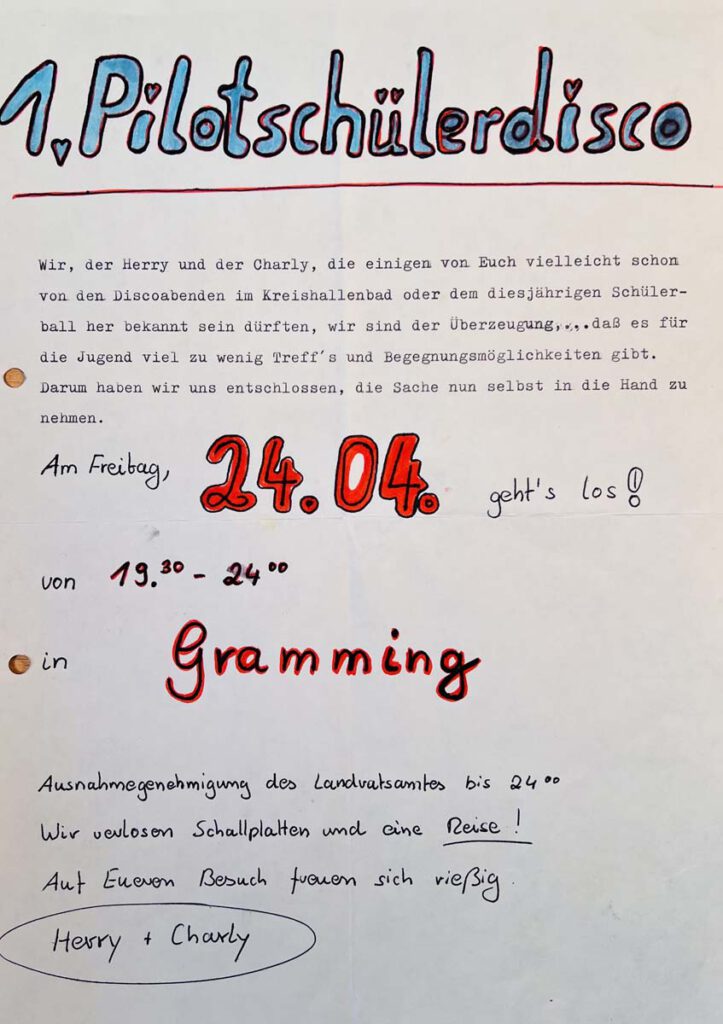 1982 organisieren Elvira & Charly Leder auf private Initiative die „PSD“ Discos. Die „Pilot-Schüler-Disco“ (PSD) war der Treffpunkt für die Landkreisjugend.